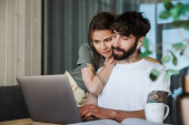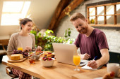 Młoda biała para korzystająca z laptopa i jedząca lunch siedząc przy stole w domu