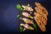Bruschetta z bekonem lub jamonem, mikro-zielenią, świeżym ogórkiem i kiełkami, na czarnej płycie. Zbliżenie na niebieskim tle. Rama pionowa, widok z góry