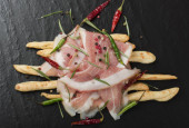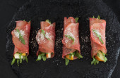 Zdjęcie "Bruschetta z bekonem lub jamonem, mikro-zielenią, świeżym ogórkiem i kiełkami, na czarnej płycie. Zbliżenie na niebieskim tle. Rama pionowa, widok z góry" może być wykorzystywane do celów osobistych i komercyjnych zgodnie z warunkami zakupionej licencji Royalty-free. Obraz jest dostępny do pobrania w jakości wysokiej rozdzielczości do 5760x3840.