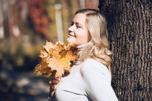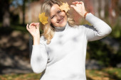 Atrakcyjne uśmiechnięta kobieta w średnim wieku z długimi falowanymi jasnymi włosami w swetrze roll-neck trzymać bukiet upadłych żółtych liści.