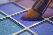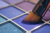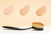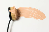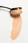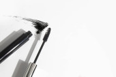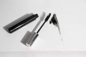 Tusz do rzęs leży na białym tle i pozostawia czarny ślad pokazujący, jak działa szczotka. Kosmetyki i makijaż pielęgnacja osobista.