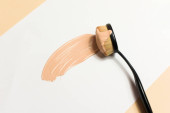 Tusz do rzęs leży na białym tle i pozostawia czarny ślad pokazujący, jak działa szczotka. Kosmetyki i makijaż pielęgnacja osobista.
