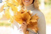 Przystojna uśmiechnięta kobieta w średnim wieku z długimi falującymi jasnymi włosami w swetrze z kręconym dekoltem trzymać żółte liście klonu w pobliżu głowy.