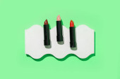 Szminka w różnych kolorach, opcje odcieni. Kosmetyki na gołym tle. Piękne przykłady szminek, różowe i czerwone. Moda