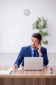 brodaty biznesmen z identyfikatorem rozmawiający na smartfonie i korzystający z laptopa w pokoju hotelowym