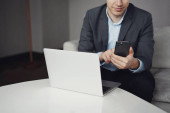 Zdjęcie "przycięty widok brodatego biznesmena z identyfikatorem przy użyciu smartfona w pobliżu laptopa w pokoju hotelowym" może być wykorzystywane do celów osobistych i komercyjnych zgodnie z warunkami zakupionej licencji Royalty-free. Obraz jest dostępny do pobrania w jakości wysokiej rozdzielczości do 5760x3840.