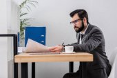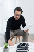 brodaty mężczyzna w garniturze piszący na notatniku przy dokumentach w pokoju hotelowym