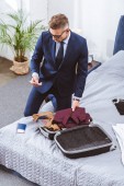 widok człowieka w garniturze rozpakowywanie bagażu w pokoju hotelowym