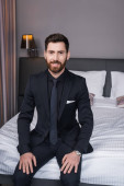 brodaty biznesmen w okularach i garniturze siedzi na łóżku w pokoju hotelowym