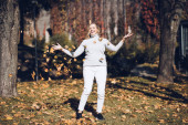 Cute uśmiechnięta kobieta w średnim wieku z długimi falowanymi jasnymi włosami w szarym swetrze roll-neck zwymiotować stos żółtych liści klonu.