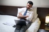 brodaty mężczyzna w garniturze i okularach patrząc na rozmyty laptop w hotelu