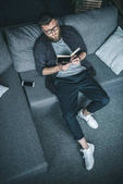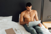 brodaty mężczyzna w okularach patrząc na dokument w pobliżu gadżetów na łóżku hotelowym