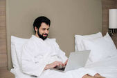 brodaty mężczyzna wiążący sznurówki na butach w hotelu