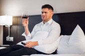 brodaty mężczyzna trzyma szklankę brandy i siedzi w łóżku hotelowym