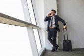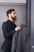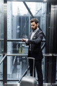 brodaty mężczyzna z bagażem wchodzący do pokoju hotelowego