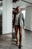 brodaty mężczyzna w garniturze trzymający uchwyt bagażu odwracając wzrok w korytarzu hotelu