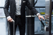 widok człowieka z przyciskiem bagażu w nowoczesnej windzie, baner