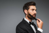 wesoły mężczyzna w garniturze dopasowanie kołnierz koszuli w pokoju hotelowym