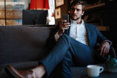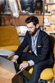 brodaty mężczyzna w garniturze za pomocą smartfona w hotelowym foyer