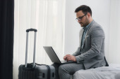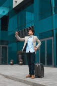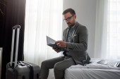 brodaty mężczyzna w garniturze z uchwytem bagażu podczas kontroli czasu w hotelowym foyer