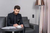 brodaty biznesmen piszący w notatniku w hotelowym foyer