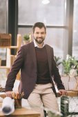 radosny biznesmen w garniturze rozmawiający na smartfonie i trzymający papierowy kubek w hotelowym lobby