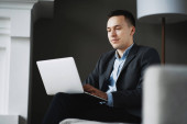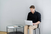 mężczyzna w koszuli i okularach piszący na notatniku przy laptopie w pokoju hotelowym