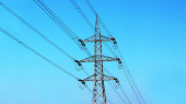 Wysokonapięciowe linie energetyczne nad błękitnym niebem, wieża przesyłowa wysokiego napięcia, układ panoramiczny