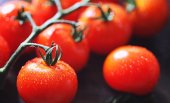Ekologiczne świeże pomidory wiśniowe na drewnianym tle.