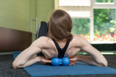Dziewczyna siedząca na macie do jogi masuje mięśnie ud wałkiem piankowym. Ćwiczenia domowe. Sprzęt do MFR
