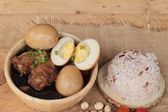 Lontong Cap Go Meh. Peranakan danie z ciasta ryżowego z kurczaka curry, pikantny Chayote, gotowane jajka i krakersy krewetki. Widok z góry