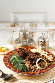 Nasi Kebuli (Kabuli Rice), Pilaf arabski lub indyjski z żeberkami lub jagnięciną wołową, na drewnianym stole