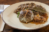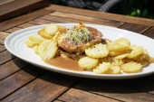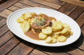 nowe ziemniaki z grzybowym królikiem w talerzu na szarym tle
