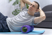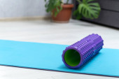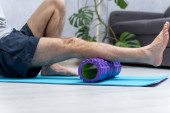 Ćwiczenia domowe. Młoda kobieta masuje mięśnie uda wałkiem do masażu z pianki. Sprzęt do uwalniania do mięśnia sercowego.