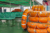 Zdjęcie "Pomarańczowe nadmuchiwane łodzie ratunkowe na pokładzie promu w nagłych wypadkach i wypadkach morskich. Łódź ratunkowa, tratwa na dachu promu. Łodzie ratunkowe na dużym statku na oceanicznym statku morskim.Transport i bezpieczeństwo." może być wykorzystywane do celów osobistych i komercyjnych zgodnie z warunkami zakupionej licencji Royalty-free. Obraz jest dostępny do pobrania w jakości wysokiej rozdzielczości do 5760x3840.
