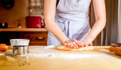 Kobieta w fartuchu ugniata ciasto. Close - w górę widok rąk. Odbiór. Koncepcja domowego jedzenia.