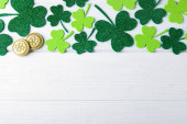 Top view photo of st patrick's day decorations green shamrocks trefoil shaped confetti and a lot of gold coins on isolated yellow background with copyspace