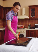 Młode, kaukaskie kobiety przygotowują razem jedzenie w kuchni. Zamknij drzwi. Widok z boku. Rozsypują sos na pizzy. Koncepcja domowej kuchni i relacji LGBT.