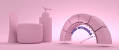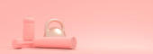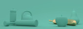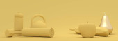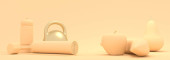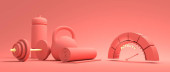 Trening siłowy i sprzęt do ćwiczeń domowych i fitness. Hantle, szylingi, mata do jogi i butelka. Narzędzia dla zdrowego stylu życia i dobrego samopoczucia. Urządzenie do pomiaru aktywności ze strzałką i skalą. Renderowanie 3D