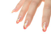 Francuski manicure z malowanymi stokrotkami na długich kwadratowych paznokciach zbliżenie na białym tle. Poparzone ręce.