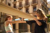 Prawdziwa para młodych kobiet nagrywa filmy z telefonem komórkowym do swoich wyzwań w aplikacjach mobilnych i sieciach społecznościowych. Kołowrotek koncepcyjny, wideo, tańce, wyzwanie.