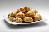 Porcję chleba słynny brazylijski ser biały urządzone Taca, na rustykalne drewniane tła