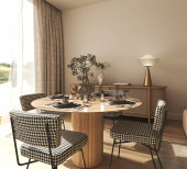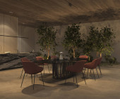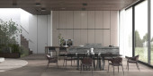 Minimalizm wystrój wnętrz kuchnia i jadalnia. Współczesna wyspa i krzesła, kamienna podłoga, drewniany sufit. 3D renderowanie ilustracja baner web.