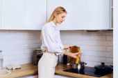 Zdjęcie "Młoda radosna kobieta w białej koszulce przykrywająca jedno oko plasterkiem ogórka i uśmiechnięta do aparatu, kobieta bawiąca się podczas gotowania w nowoczesnej białej kuchni w domu" może być wykorzystywane do celów osobistych i komercyjnych zgodnie z warunkami zakupionej licencji Royalty-free. Obraz jest dostępny do pobrania w jakości wysokiej rozdzielczości do 5760x3840.