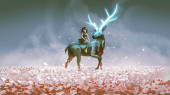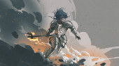 Kobieta z magiczną włócznią stojąca przed swoim wilkiem stróżem, cyfrowy styl sztuki, obraz ilustracyjny