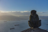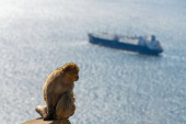 Dziki makak Barbary siedzi i je na Skale Gibraltarskiej, Europa, w tle kontynent afrykański