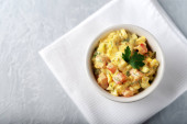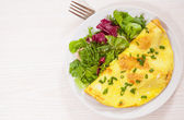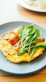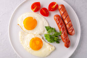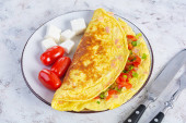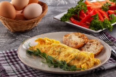 Lekkie śniadanie z francuskich omletów z kiełbasą, pomidorami i mikrozielonymi. Śniadanie europejskie