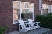 Typowa fasada domu z ogrodem, roślinami i miejscami do siedzenia w starym mieście ZIERIKZEE na Zeelandzie, Holandia