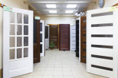 Drzwi wejściowe na sprzedaż w wyspecjalizowanym sklepie. Kupujący wolą metalowe drzwi, stylizowane na drewniane.