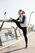 Uśmiechnięta młoda, biała sportowiec z protezą nogi stojąca na mostku outdoo za pomocą telefonu komórkowego
